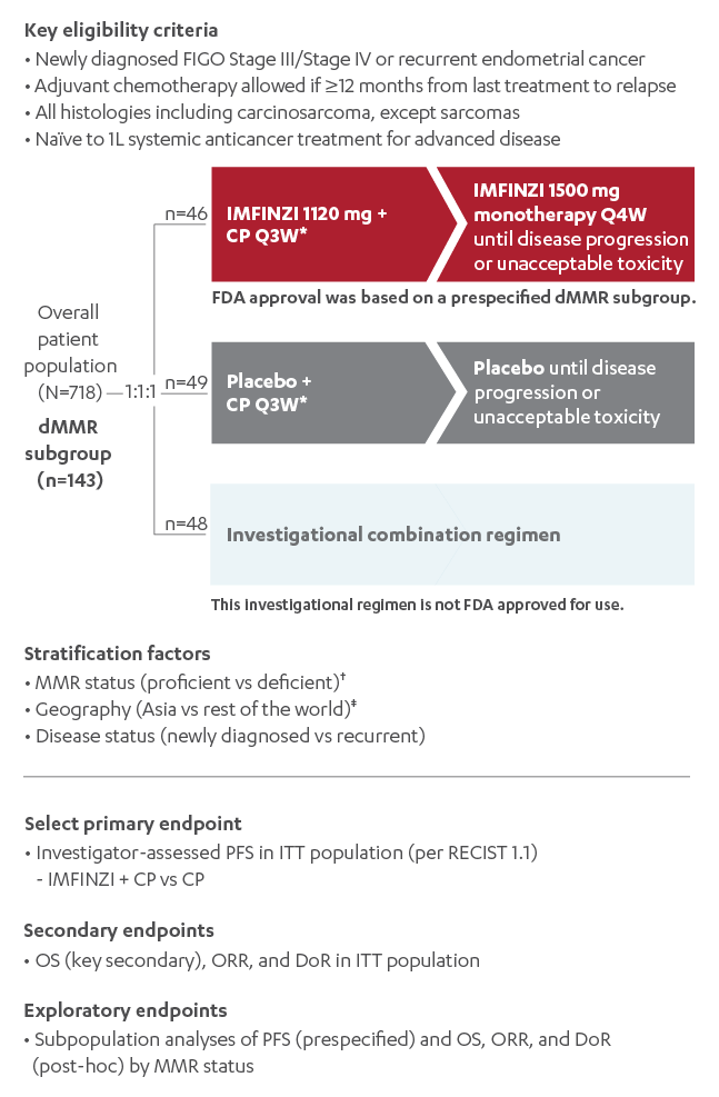 On June 14, 2024, the FDA approved durvalumab (Imfinzi) for adult patients with advanced, recurrent, or primary endometrial cancer with dMMR. This decision came after the randomized, multicenter DUO-E trial (NCT04269200) demonstrated statistically significant improvement in progression-free survival (PFS) in the overall population when durvalumab was administered along with carboplatin and paclitaxel. The trial further revealed that patients with dMMR tumors experienced the greatest benefit.