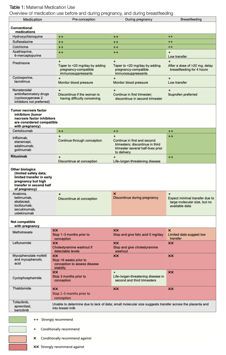 - Contraindicated medications: Cyclophosphamide, methotrexate, and mycophenolate remain off-limits during pregnancy due to their known teratogenic effects. The guidelines outline specific timelines for discontinuing these drugs before conception.