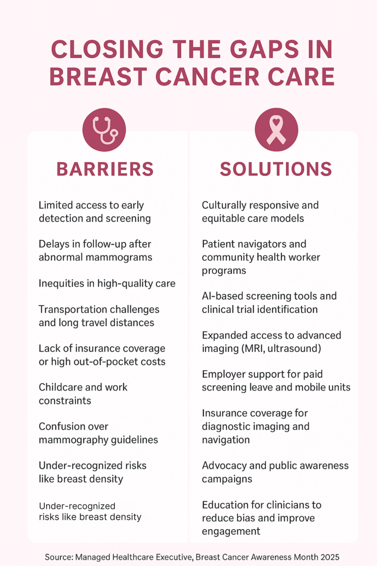 Now is the time for stakeholders in all sectors to figure a path forward, coordinating efforts and sharing innovative ideas so every patient, regardless of insurance status, location, or background, receives the best possible care. As we continue to refine and reimagine breast cancer care, our focus must remain steadfast on the human element at the very heart of this journey. The power of personal stories, community engagement, and clear, accessible information can transform the patient experience—one step at a time.
